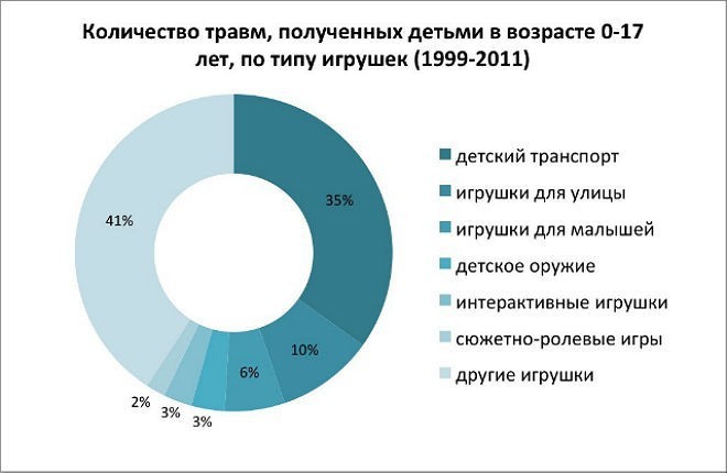 В соответствии с данными статьи, опубликованной недавно в журнале Clinical Pediatricsоколо 150 тысяч детей в Америке ежегодно госпитализируют с травмами, полученными из-за игрушек (по России такой статистики, к сожалению, нет). Авторы статьи, обработав данные, собранные в клиниках за более чем 20 лет, выяснили, что наиболее опасными для детей являются скутеры, самокаты, скейтборды, электрокары и другие игрушки на колесах.