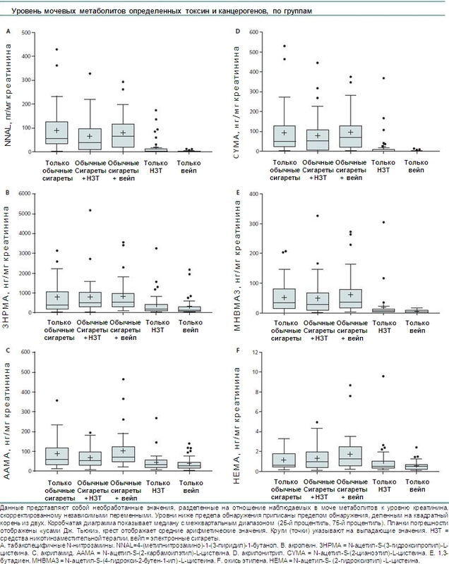 При учете и контроле независимых переменных уровни никотина из анализов мочи и слюны оказались на примерно одинаковом уровне у всех исследуемых групп. Группы «только электронная сигарета» и «только НЗТ» имели значительно более низкие уровни табако-специфических нитрозаминов (в том числе канцерогенного метаболита 4- (метилнитрозамино)-1-(3-пиридил)-1-бутанол [NNAL]) и летучих органических соединений [ЛОС] (в том числе таких токсин, как акролеин, акриламид, акрилонитрил, 1,3-бутадиен и окись этилена), чем группы пользователей «только обычная сигарета», «обычная сигареты вместе с электронной» и «обычная сигарета вместе с НЗТ». Группа «только электронная сигарета» имела значительно более низкие уровни NNAL, чем во всех других группах. УровеньNNAL у пользователей электронных сигарет оказался на 97% ниже, чем у курящих обычные сигареты. Группы «только обычная сигарета», «обычная сигарета вместе с электронной» и «обычная сигарета вместе с НЗТ» имели схожий уровень TSNA и ЛОС. TSNA и ЛОС cпособствуют развитию рака, сердечнососудистых и легочных заболеваний, следовательно, низкий уровень этих веществ в электронных сигаретах говорит о том, что данный вид доставки никотина более безопасен, чем обычное курение.