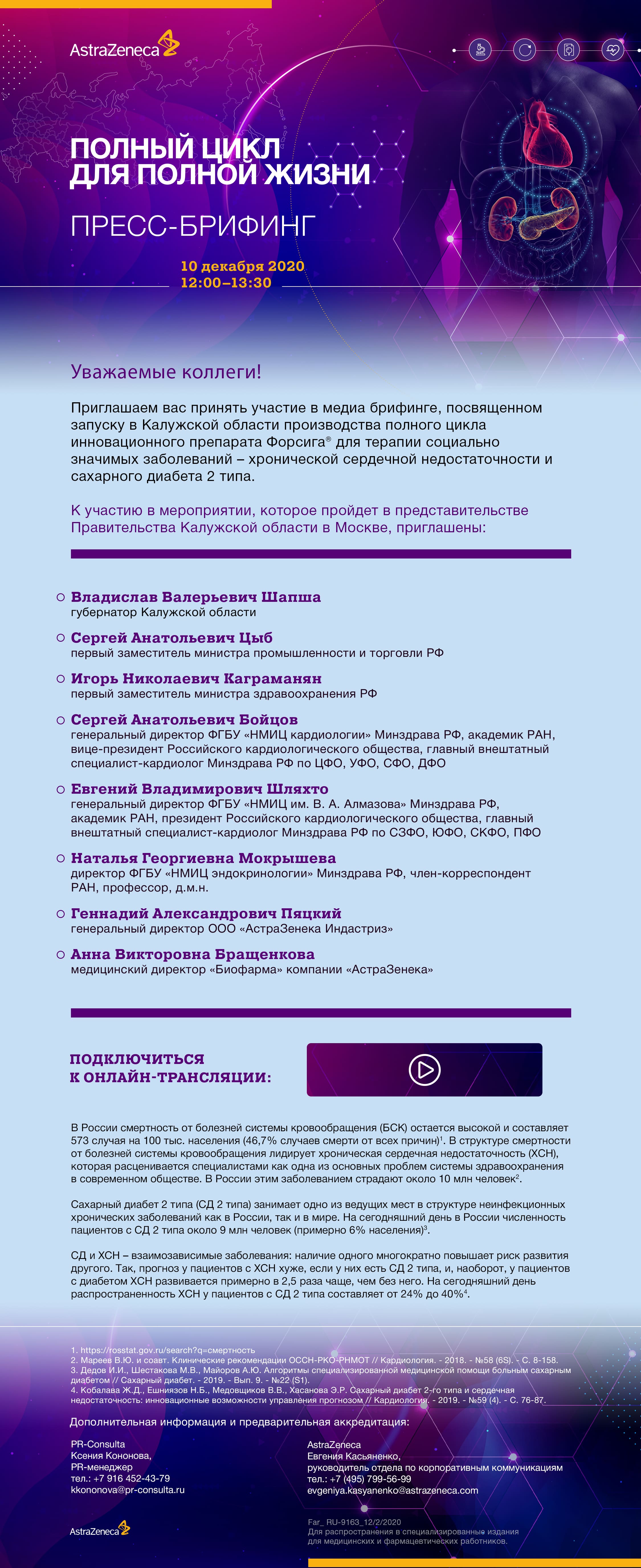 Приглашаем вас принять участие в медиа брифигне, посвященном запуску в Калужской области производства полного цикла препарата Форсига: